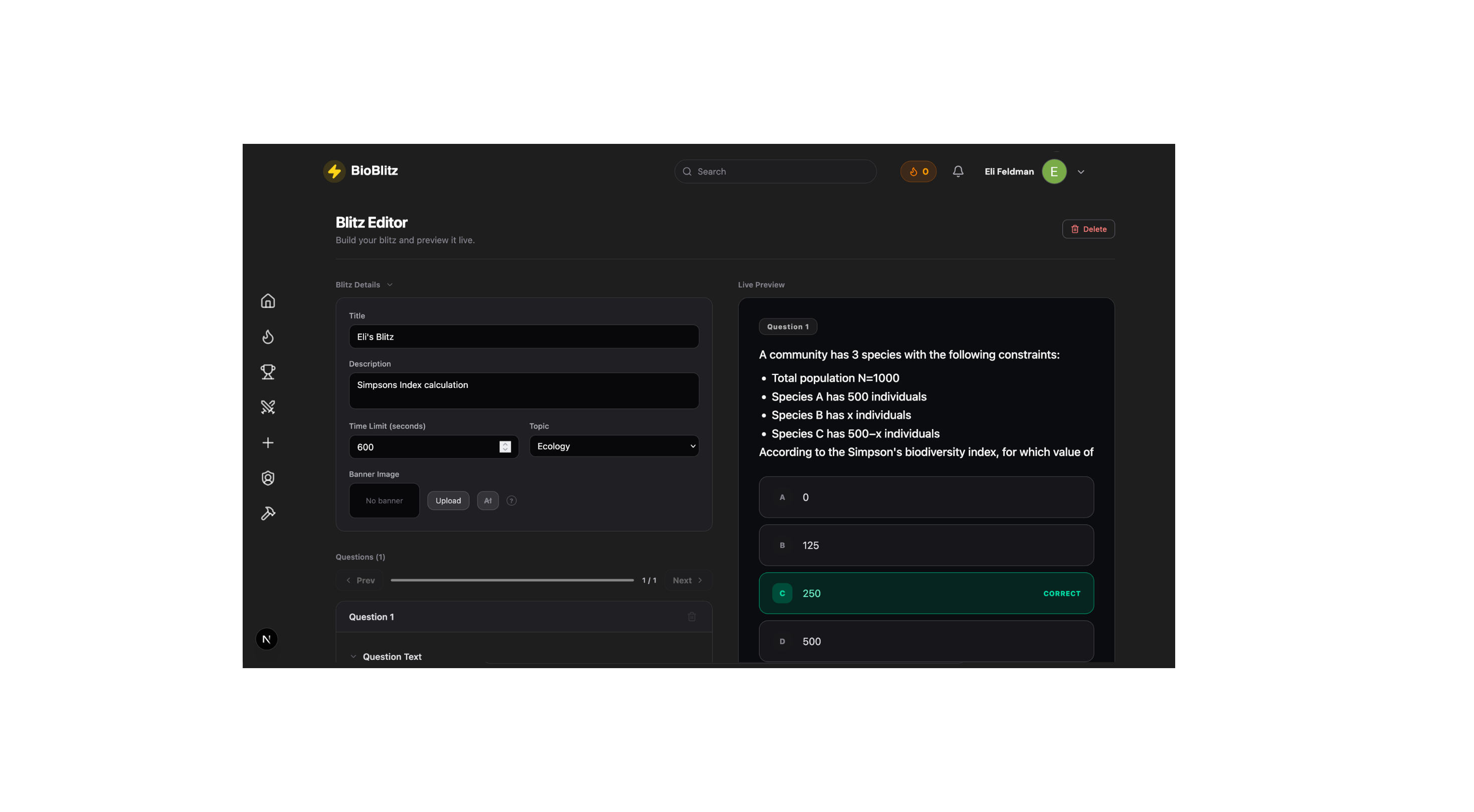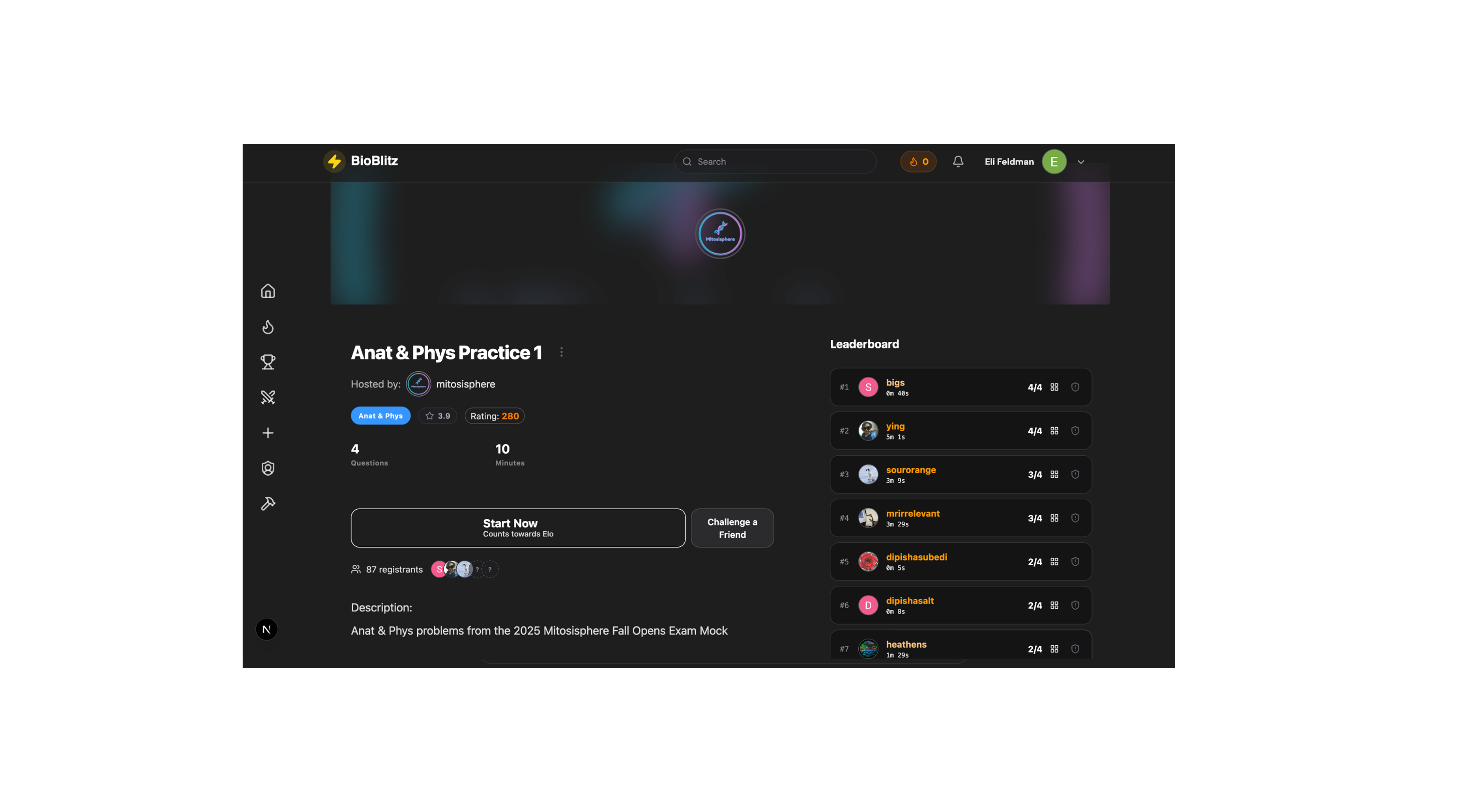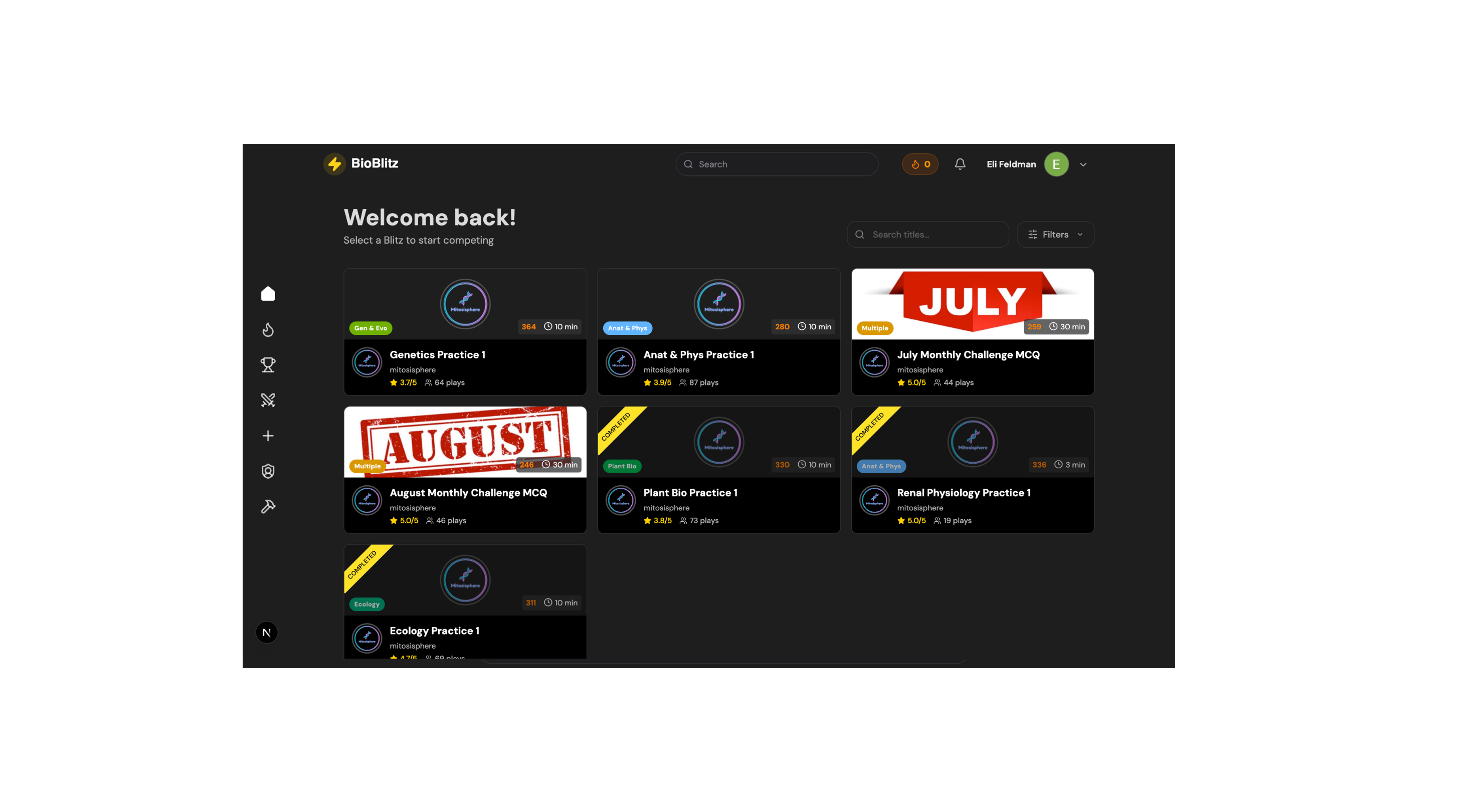 The home page will show a list of blitzes. Each will be created by a user on the platform. Mitosisphere is a team of problem writers that make many of the questions. Each contest is assigned a rating based on how difficult it is. A blitz with a higher rating indicates more challenging content, dynamically determined by how users performed on the blitz.